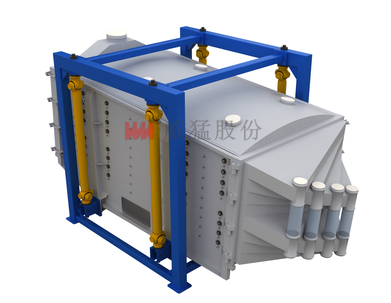 威猛振動分布篩-Z對粉狀、顆粒狀物料的篩選和分級,有獨特的效果,廣泛應用于化工、醫藥、食品、金屬、冶金、礦山等行業。其原理為利用振動電機激振作為振動源,使物料在篩網上被拋起,同時向...